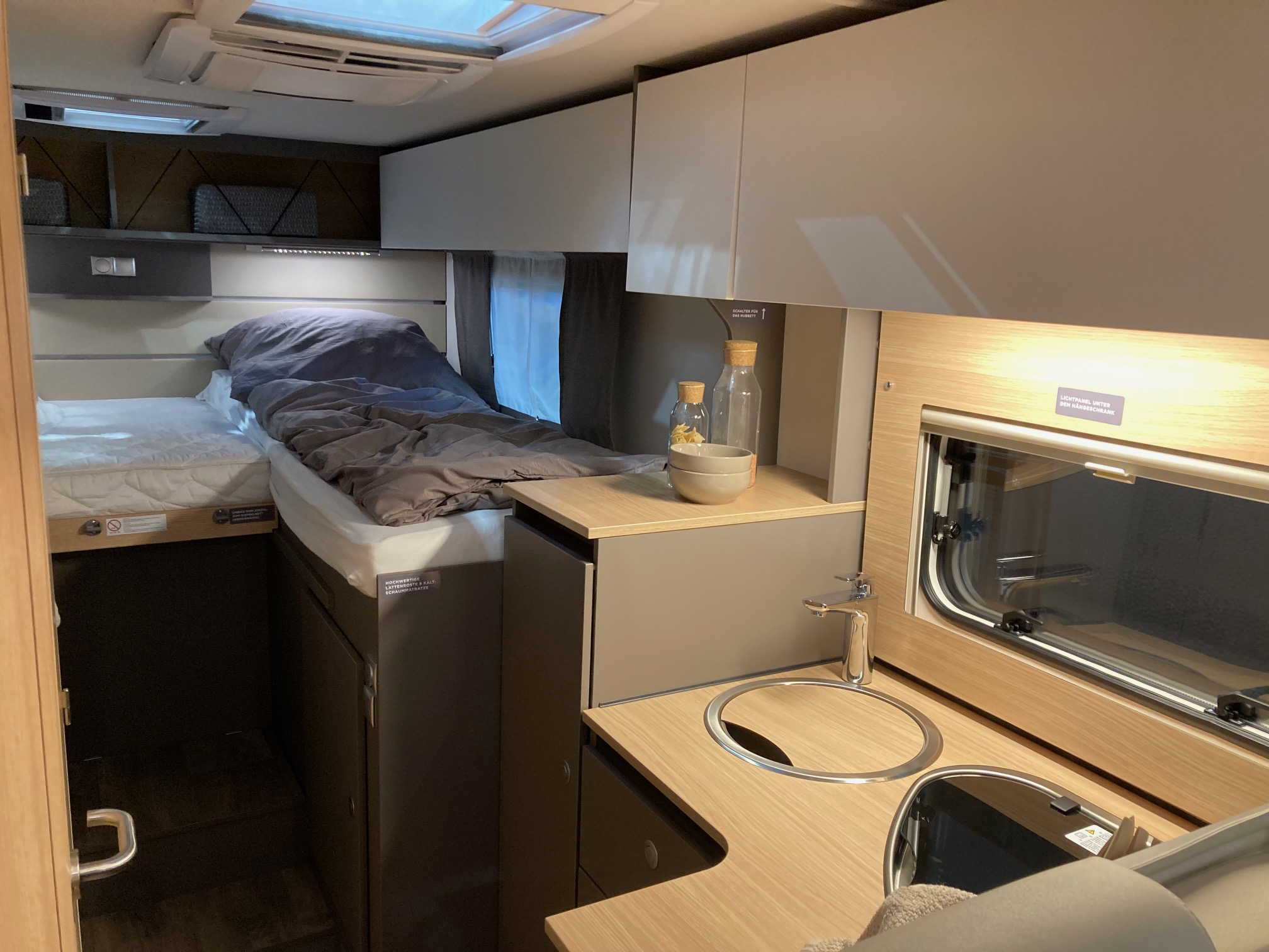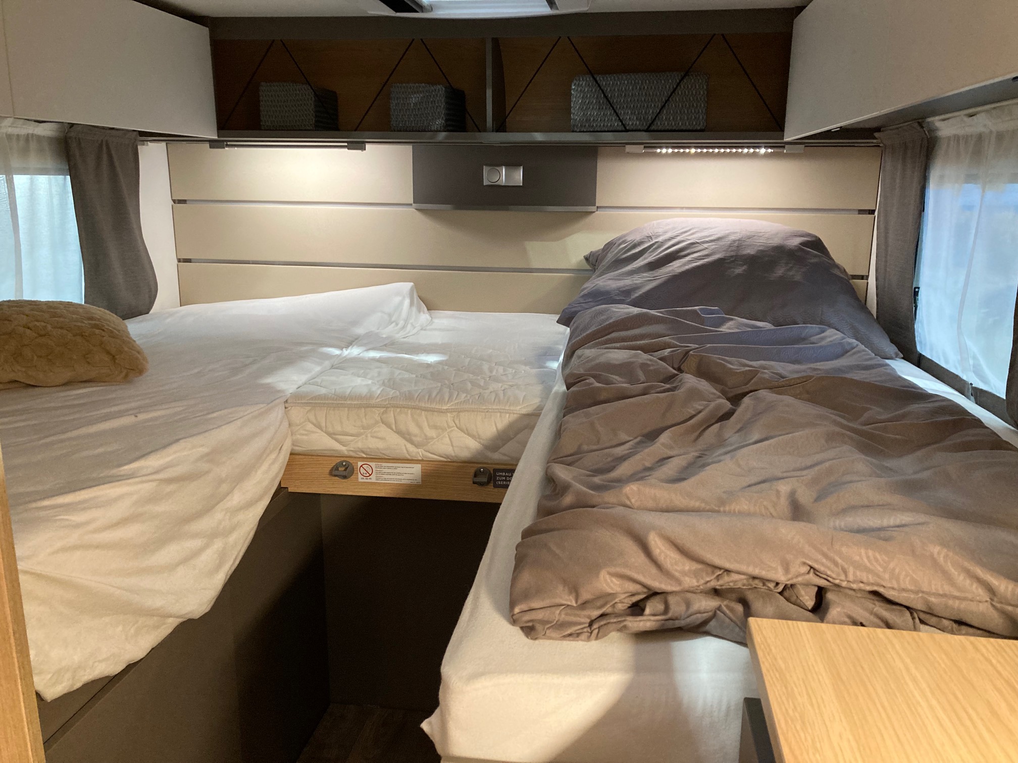2 Einzelbetten im Heck mit wenigen Handgriffen umgebaut zum Doppelbett und Hubbett mit zwei Schlafplätzen über der Sitzgruppe, komfortabel ausgestattet mit 3-Flamm-Kocher, Kühlschrank 140 Liter Smarttower, separate Duschkabine, Waschraum mit elektr. Kassettentoilette, Panoramadachhaube im Bug, Fliegenschutztür, DuoControl mit Crashsensor (ermöglicht das Heizen im Wohnraum an kalten Tagen während der Fahrt), große Heckgarage, Markise, Fahrradträger, Multimediaradio mit Apple Car Play und Android Auto, Stellplatzatlas, Rückfahrkamera, SAT-Anlage mit TV, Solaranlage,...Campingmöbel und Geschirr sind gegen einen geringen Aufpreis erhältlich (soweit vorrätig).